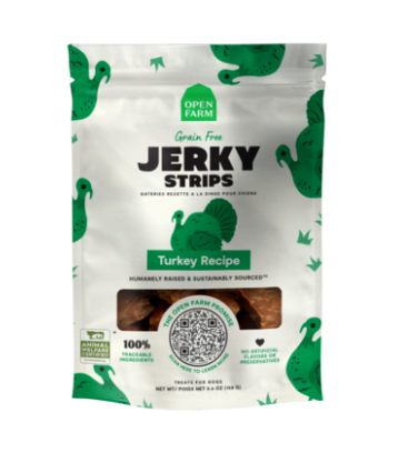 Our Turkey Jerky Strips feature humanely-raised turkey to deliver an incredible taste your dog will crave! As with all Open Farm products, our ethically sourced ingredients are 100% traceable. Our jerky strips are crafted in a way that respects animal welfare and our planet. Approximately 7-8 strips per bag.