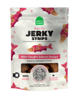 Our Wild-Caught Salmon Jerky Strips feature Ocean Wise recommended salmon to deliver an incredible taste your dog will crave! As with all Open Farm products, our ethically sourced ingredients are 100% traceable. Our jerky strips use ingredients sourced in a way that helps protect our oceans and waterways. Approximately 7-8 strips per bag.