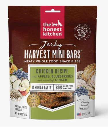 The Honest Kitchen Jerky Harvest Mini Bars Chicken Recipe with Apples & Blueberries Dog Treats, 4-oz bag